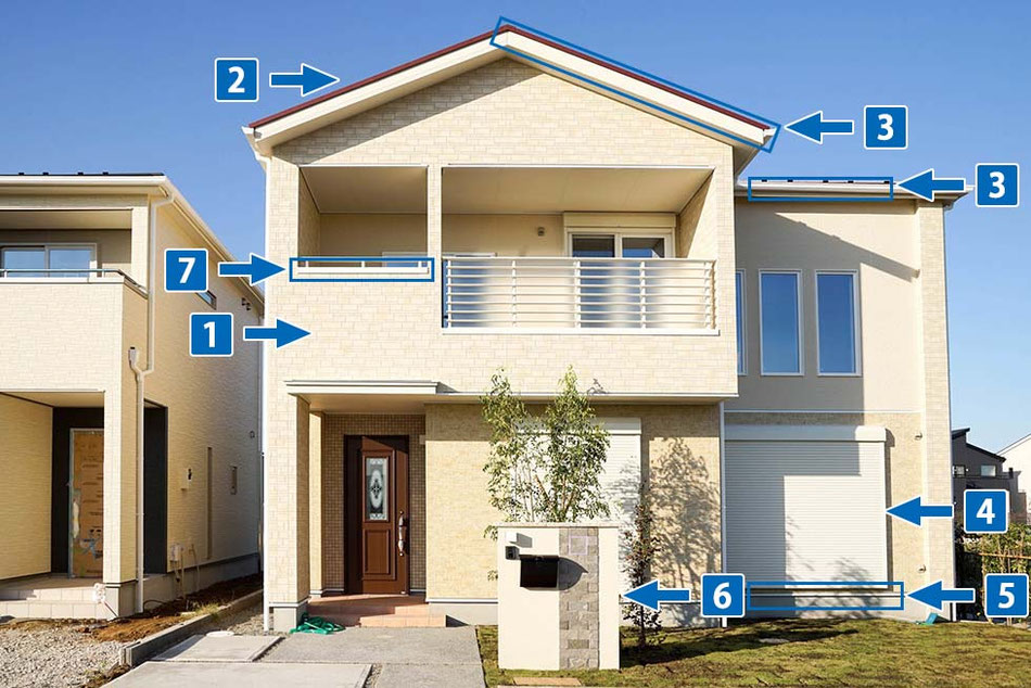 1:外壁 2:屋根 3:破風板・鼻かくし 4:雨戸 5:水切り 6:塀 7:笠木
