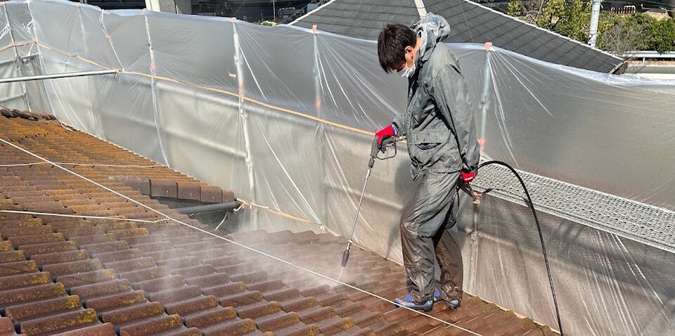屋根カラーベスト洗浄工事、汚れ、旧塗膜を徹底的に落とし、強化シーラー+中塗り+上塗り、計3~4回塗り仕上げになります。